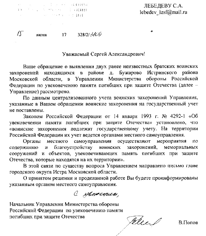 7 мая было направлено письмо в УППЗО Управление Министерства Обороны РФ... 16 июня был получен ответ от УППЗО МО РФ... Ну, подумали мы, на этом всё и закончится...