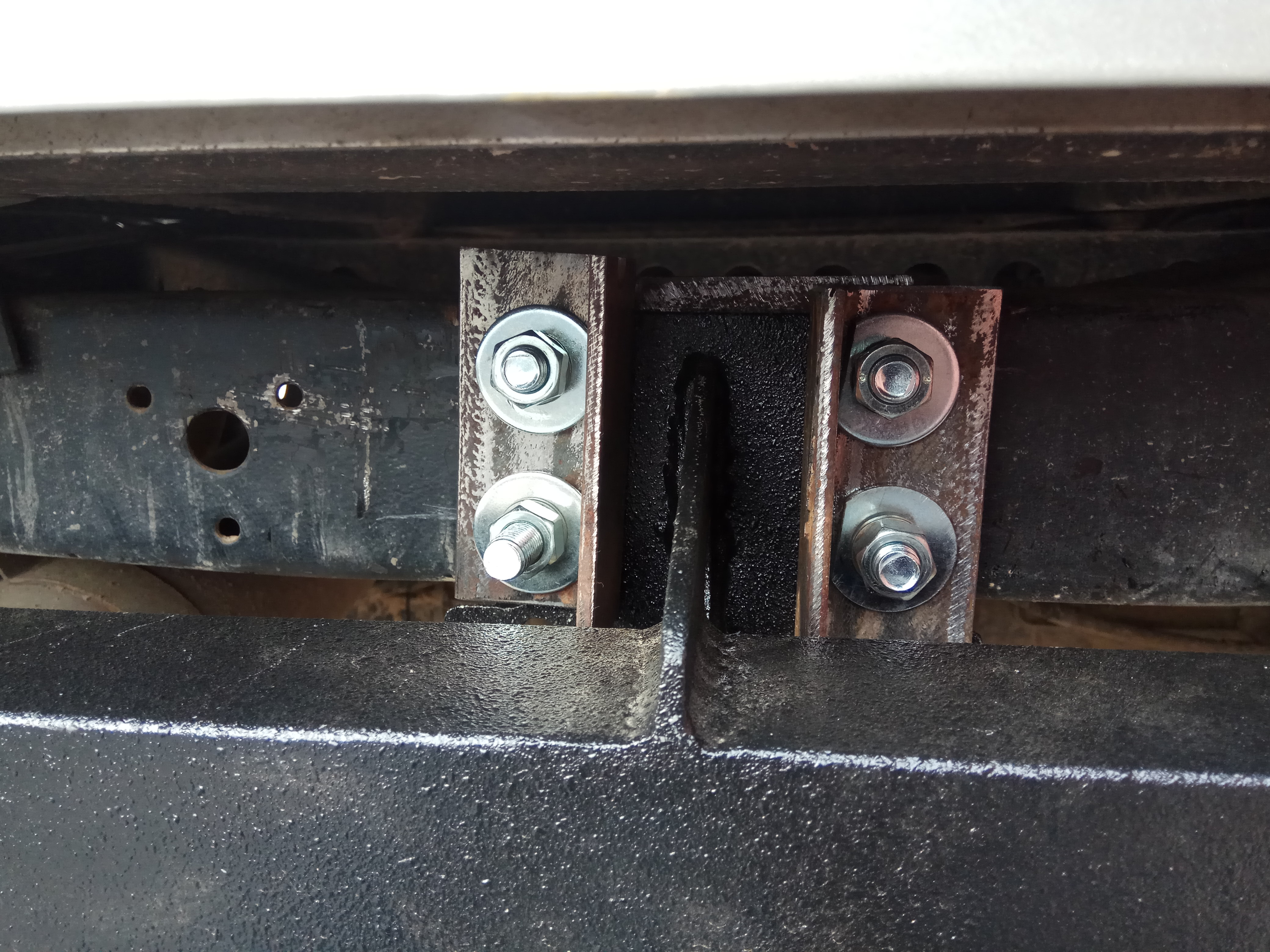 Вот и я наконец-то поставил калитку. Косяков конечно много, начиная с того, что пришлось срезать штатные буксирные проушины, подрамник не прилегал к раме. Отверстия креплений не подходили, приходилось подпиливать или сверлить заново. Крепления подрамника показались слабоваты, их усилили. В общем пришлось поработать. Результат радует.