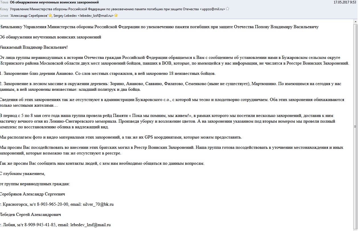 7 мая было направлено письмо в УППЗО Управление Министерства Обороны РФ... 16 июня был получен ответ от УППЗО МО РФ... Ну, подумали мы, на этом всё и закончится...