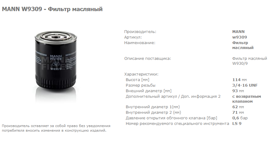 фильтр MANN W930/20- в нём открытие клапана при единичке. Высота правда 114, может его имели в виду.